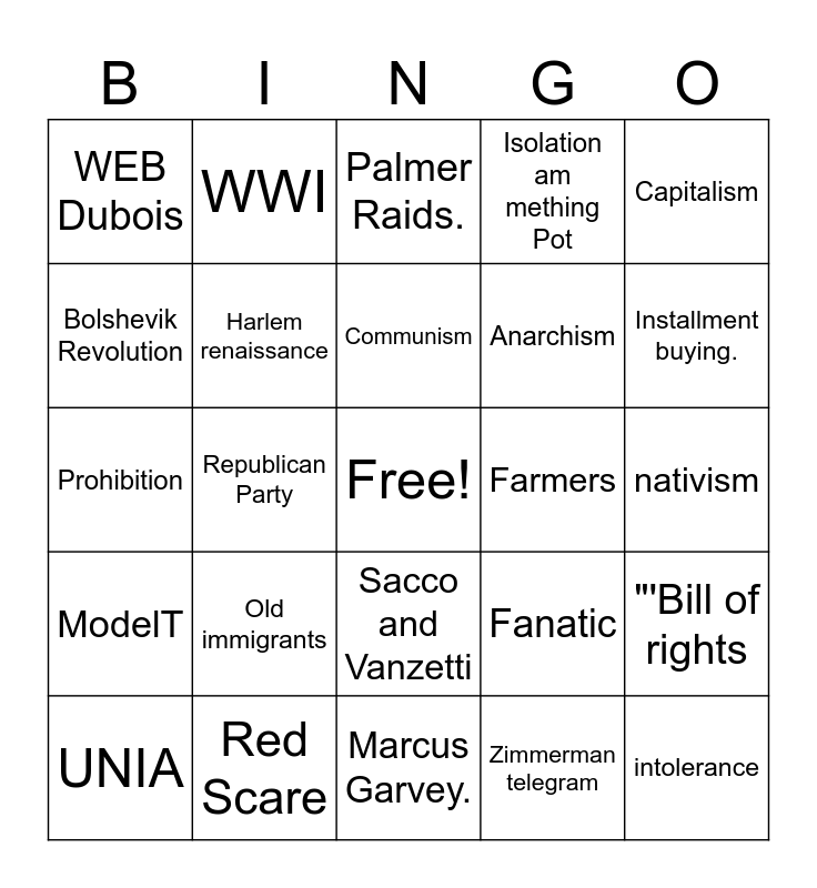 This bingo card has a free space and 25 words: Old immigrants, Marcus Garvey., Communism, UNIA, Capitalism, WEB Dubois, Bolshevik Revolution, WWI, Farmers, Sacco and Vanzetti, Anarchism, Prohibition, Fanatic, "'Bill of rights, Harlem renaissance, New immigrants, nativism, Palmer Raids., Installment buying., Republican Party, intolerance, Red Scare, ModelT, Isolation am mething Pot and Zimmerman telegram.