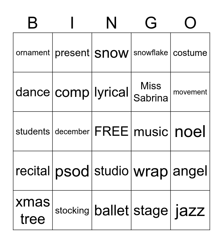 This bingo card has a free space and 24 words: psod, stocking, lyrical, xmas tree, costume, ornament, dance, present, music, studio, Miss Sabrina, students, wrap, angel, comp, stage, noel, snow, movement, december, jazz, recital, snowflake and ballet.