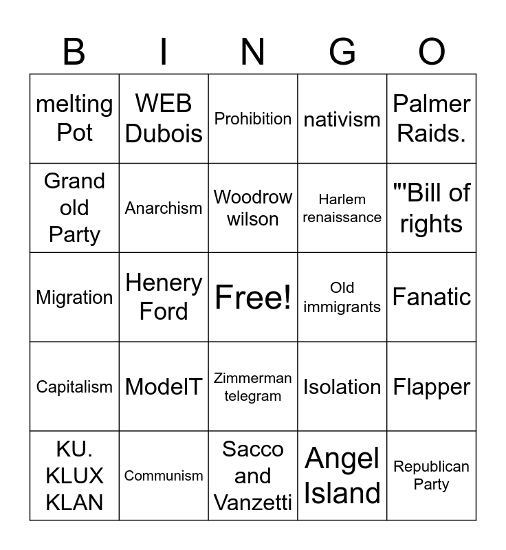 This bingo card has a free space and 25 words: ModelT, Sacco and Vanzetti, Woodrow wilson, KU. KLUX KLAN, Palmer Raids., melting Pot, Grand old Party, WEB Dubois, Old immigrants, Zimmerman telegram, Harlem renaissance, Migration, Isolation, Flapper, Anarchism, Jim Crovo laws, Fanatic, Prohibition, "'Bill of rights, Henery Ford, Republican Party, Communism, Capitalism, nativism and Angel Island.