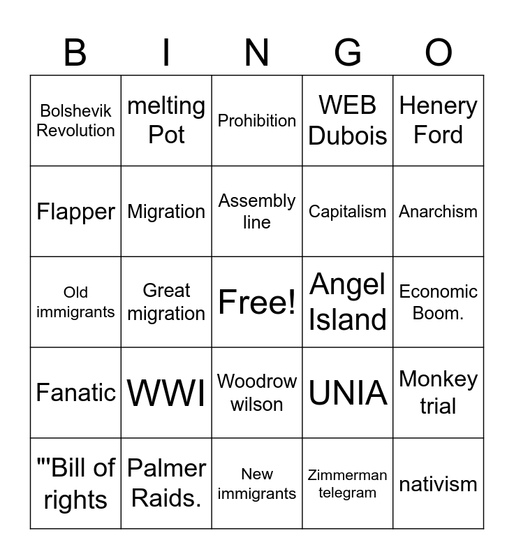 This bingo card has a free space and 25 words: WWI, New immigrants, Assembly line, "'Bill of rights, Henery Ford, Bolshevik Revolution, Flapper, melting Pot, Angel Island, Woodrow wilson, Capitalism, Old immigrants, UNIA, Monkey trial, Migration, Red Scare, Economic Boom., Prohibition, Anarchism, Great migration, nativism, Palmer Raids., Fanatic, WEB Dubois and Zimmerman telegram.
