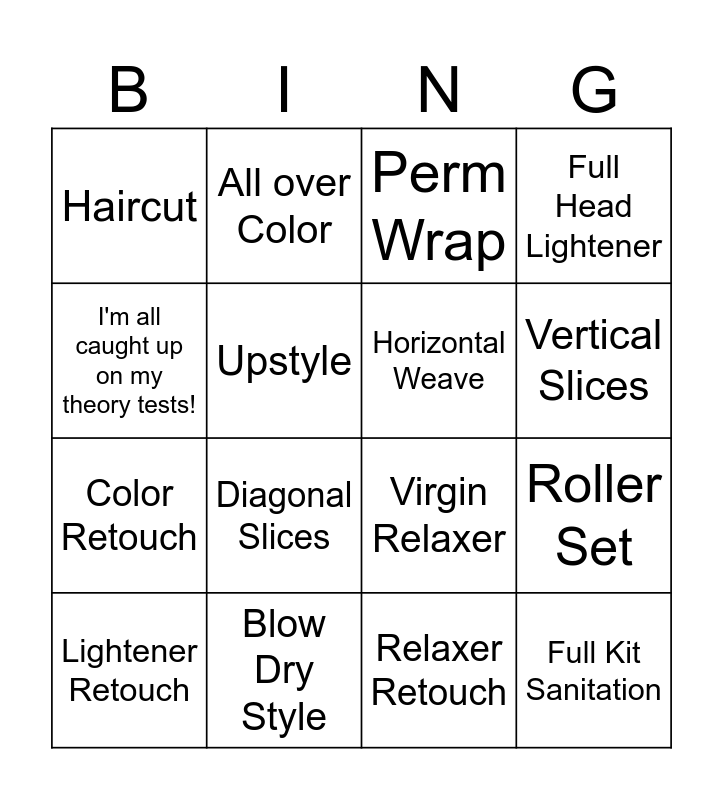 This bingo card has 16 words: Blow Dry Style, Roller Set, Perm Wrap, Haircut, Color Retouch, All over Color, Virgin Relaxer, Relaxer Retouch, I'm all caught up on my theory tests!, Upstyle, Lightener Retouch, Full Head Lightener, Diagonal Slices, Vertical Slices, Horizontal Weave and Full Kit Sanitation.