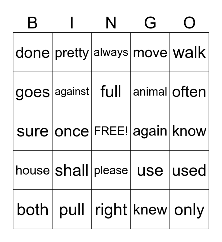 This bingo card has a free space and 24 words: shall, pull, full, both, walk, done, goes, pretty, again, please, animal, sure, use, used, against, knew, know, always, often, once, only, house, move and right.