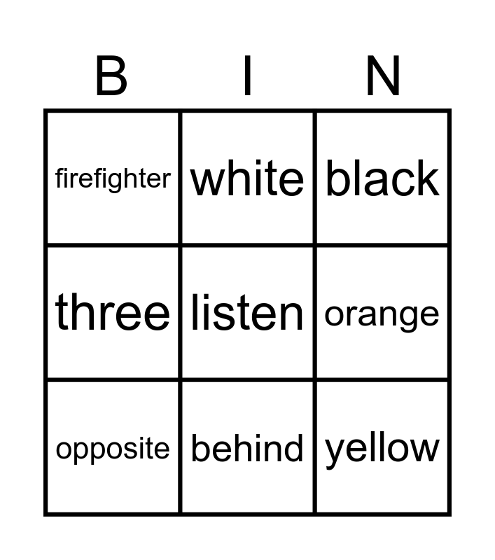 This bingo card has 27 words: green, red, yellow, blue, orange, black, white, purple, pink, one, two, three, baker, hairdresser, police officer, between, opposite, behind, next to, firefighter, doctor, nurse, farmer, read, write, listen and speak.