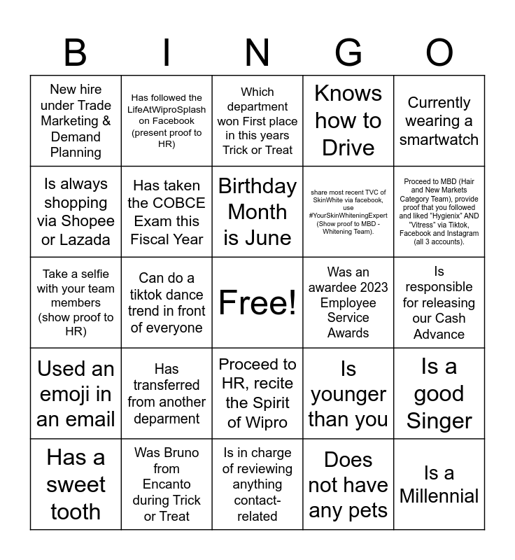 This bingo card has a free space and 24 words: Has transferred from another deparment, Was Bruno from Encanto during Trick or Treat, Birthday Month is June, Has a sweet tooth, Currently wearing a smartwatch, New hire under Trade Marketing & Demand Planning, Is always shopping via Shopee or Lazada, Has followed the LifeAtWiproSplash on Facebook (present proof to HR), Was an awardee 2023 Employee Service Awards, Proceed to HR, recite the Spirit of Wipro, share most recent TVC of SkinWhite via facebook, use #YourSkinWhiteningExpert (Show proof to MBD - Whitening Team)., Take a selfie with your team members (show proof to HR), Is younger than you, Is a good Singer, Has taken the COBCE Exam this Fiscal Year, Does not have any pets, Is responsible for releasing our Cash Advance, Which department won First place in this years Trick or Treat, Proceed to MBD (Hair and New Markets Category Team), provide proof that you followed and liked “Hygienix” AND “Vitress” via Tiktok, Facebook and Instagram (all 3 accounts)., Can do a tiktok dance trend in front of everyone, Is a Millennial, Used an emoji in an email, Knows how to Drive and Is in charge of reviewing anything contact-related.
