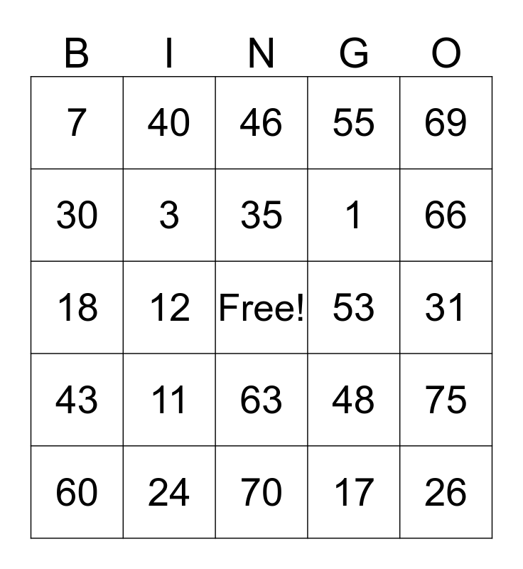 This bingo card has a free space and 24 words: 11, 24, 35, 60, 69, 7, 30, 40, 53, 63, 1, 18, 48, 75, 3, 17, 31, 46, 66, 12, 26, 43, 55 and 70.