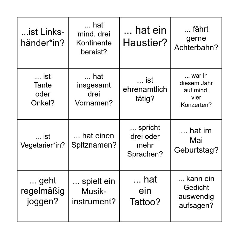 This bingo card has 16 words: ... spielt ein Musik-instrument?, ... hat im Mai Geburtstag?, ... hat ein Haustier?, ...ist Links-händer*in?, ... ist Vegetarier*in?, ... hat mind. drei Kontinente bereist?, ... spricht drei oder mehr Sprachen?, ... hat ein Tattoo?, ... ist Tante oder Onkel?, ... hat insgesamt drei Vornamen?, ... geht regelmäßig joggen?, ... fährt gerne Achterbahn?, ... hat einen Spitznamen?, ... war in diesem Jahr auf mind. vier Konzerten?, ... ist ehrenamtlich tätig? and ... kann ein Gedicht auswendig aufsagen?.