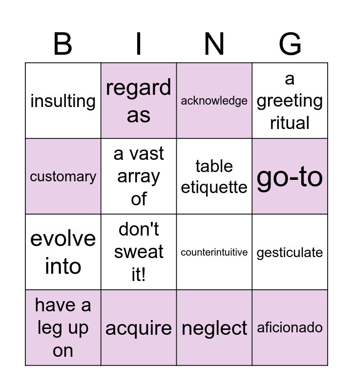 This bingo card has 16 words: acquire, gesticulate, acknowledge, insulting, evolve into, regard as, counterintuitive, neglect, customary, a vast array of, have a leg up on, a greeting ritual, don't sweat it!, go-to, table etiquette and aficionado.