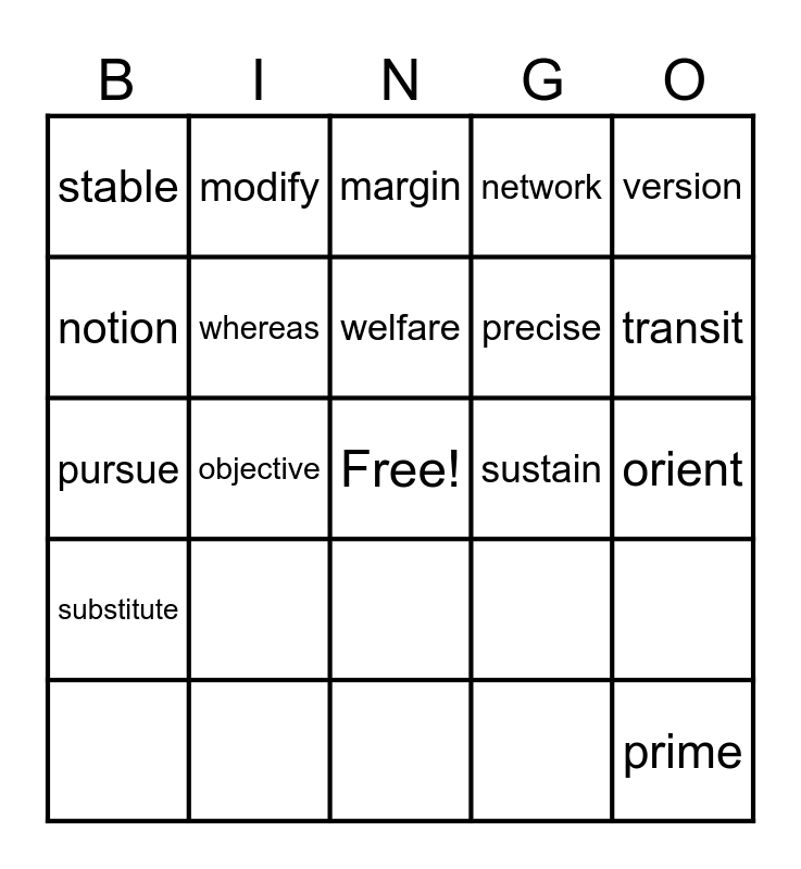This bingo card has a free space and 16 words: sustain, objective, margin, stable, precise, modify, pursue, orient, version, notion, prime, network, transit, welfare, whereas and substitute.