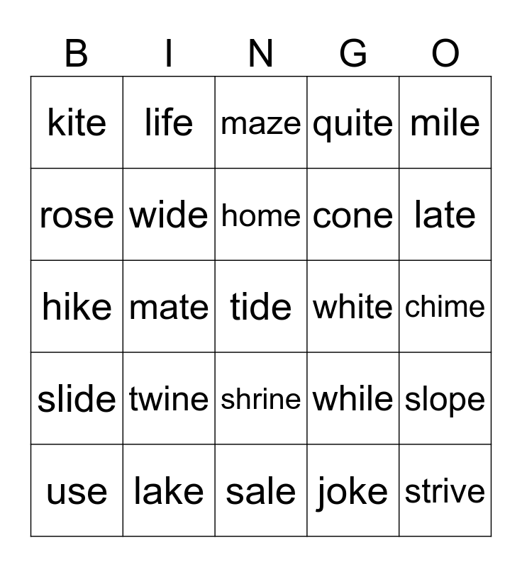 This bingo card has 37 words: Free!, dome, side, wide, slope, twine, home, while, mile, drive, mate, quite, tide, chime, rose, slide, pine, maze, shrine, white, kite, late, use, sale, fade, joke, life, ripe, flake, pole, cube, lake, hike, strive, while, cone and time.