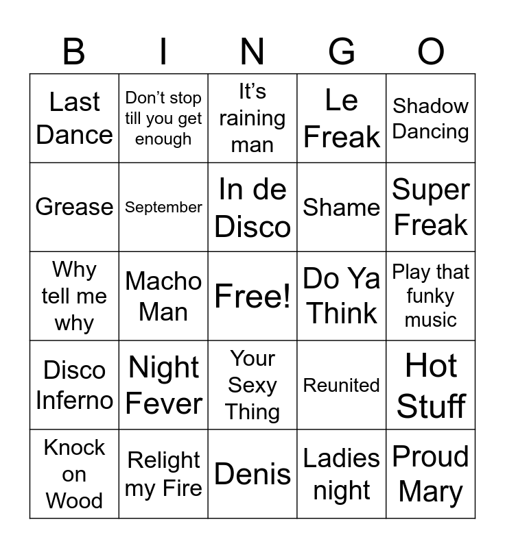 This bingo card has a free space and 42 words: Ich bin wir du, In de Disco, Dancing Queen, Night Fever, Ladies night, Hot Stuff, Proud Mary, More than a Woman, It’s raining man, Your Sexy Thing, Play that funky music, Super Freak, Macho Man, Shadow Dancing, Celebration, Reunited, You and me, Why tell me why, Best of my Love, Don’t stop till you get enough, Grease, Of the Wall, YMCA, Last Dance, Gimme Gimme Gimme, Stayin’ Alive, Shame, You got the Look, That’s the way I like it, Endless Love, Upside Down, Disco Inferno, September, Denis, Blame it on the boogie, Knock on Wood, Relight my Fire, Do Ya Think, Get down on it, Tigerfeet, Le Freak and Ain’t nobody.