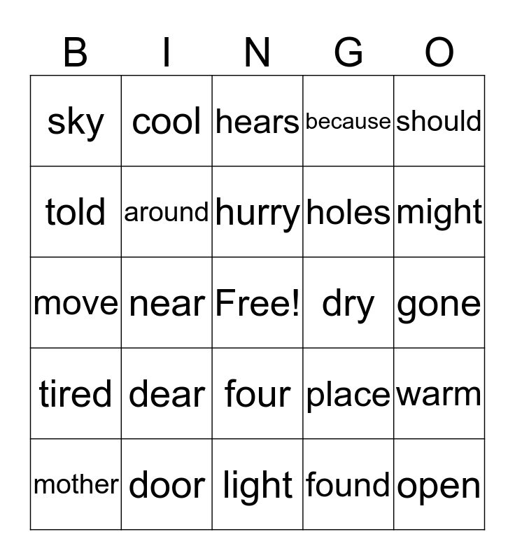 This bingo card has a free space and 24 words: dear, door, hurry, mother, should, sky, told, cool, dry, four, holes, move, place, warm, around, found, gone, hears, might, near, open, tired, because and light.