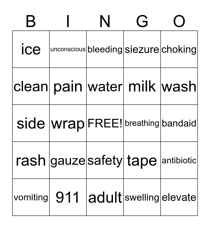 This bingo card has a free space and 24 words: gauze, 911, water, vomiting, choking, ice, clean, unconscious, breathing, safety, milk, side, tape, antibiotic, pain, swelling, bandaid, bleeding, wash, wrap, elevate, rash, siezure and adult.