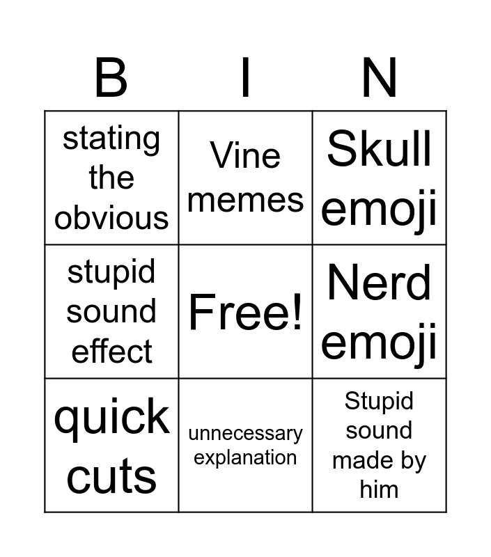 This bingo card has a free space and 14 words: Loud scream, dumb meme, quick cuts, Vine memes, stupid sound effect, Stupid sound made by him, Mic peaks, raises his voice, unnecessary explanation, stating the obvious, Fades into a random image, Nerd emoji, Skull emoji and freaks over jackshit.
