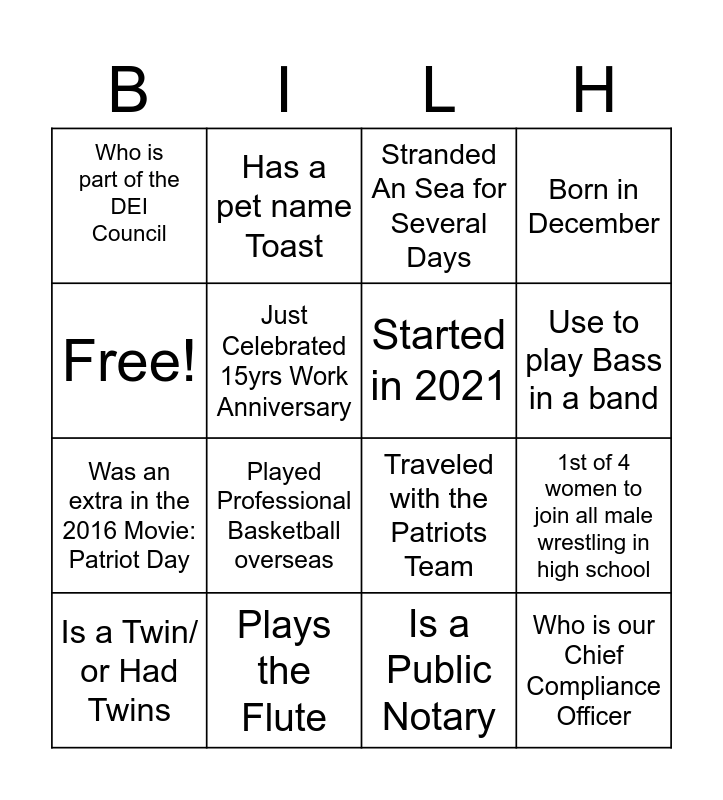 This bingo card has 16 words: Plays the Flute, 1st of 4 women to join all male wrestling in high school, Stranded An Sea for Several Days, Who is part of the DEI Council, Was an extra in the 2016 Movie: Patriot Day, Has a pet name Toast, Traveled with the Patriots Team, Is a Public Notary, Free!, Just Celebrated 15yrs Work Anniversary, Is a Twin/ or Had Twins, Born in December, Played Professional Basketball overseas, Use to play Bass in a band, Started in 2021 and Who is our Chief Compliance Officer.