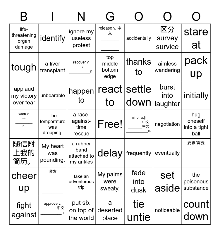 This bingo card has a free space and 48 words: fade into dusk, aimless wandering, a deserted place, The temperature was dropping., happen to, hug oneself into a tight ball, identify, approve v. _______ 中文 __________n., 区分survey survice, delay, stare at, release v. 中文 ________ ________ ________, burst into laughter, settle down, cheer up, negotiation, tough, pack up, set aside, accidentally, thanks to, a race-against-time rescue, life-threatening organ damage, a liver transplant, the poisonous substance, recover v. → __________n., initially, fight against, react to, unbearable, noticeable, minor adj. _______中文 _______中文 ___________n., 要求/需要 _________ _________ _________ _________, 激发 _________ _________ _________ _________, warn v. → _________ n., frequently, eventually, applaud my victory over fear, a rubber band attached to my ankles, take an adventurous trip, 随信附上我的简历。, count down, ignore my useless protest, put sb. on top of the world, top middle bottom edge, My palms were sweaty., My heart was pounding. and tie untie.