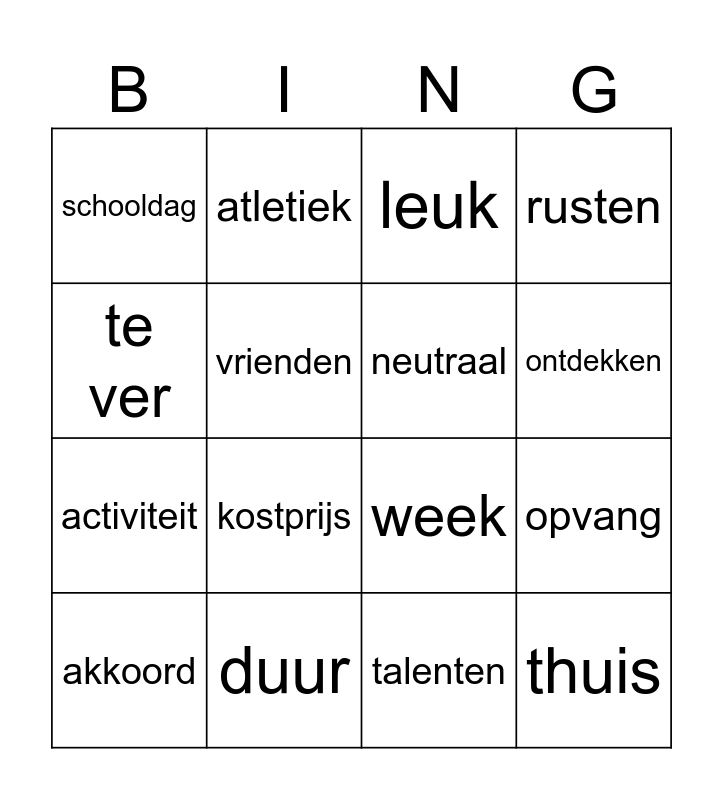 This bingo card has 16 words: duur, opvang, leuk, schooldag, activiteit, atletiek, week, talenten, te ver, vrienden, akkoord, rusten, kostprijs, ontdekken, neutraal and thuis.