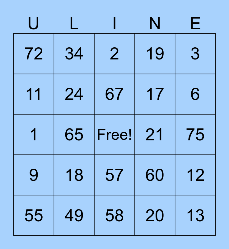 This bingo card has a free space and 24 words: 55, 18, 67, 20, 3, 72, 34, 2, 21, 75, 1, 24, 60, 12, 11, 49, 58, 19, 6, 9, 65, 57, 17 and 13.