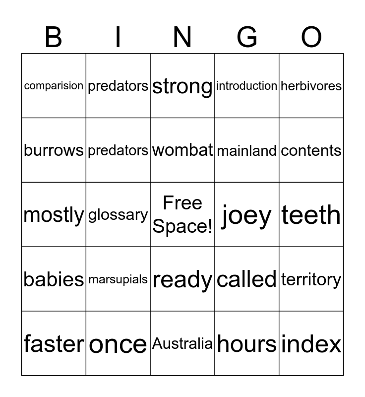 This bingo card has a free space and 24 words: marsupials, once, wombat, faster, herbivores, comparision, burrows, predators, joey, ready, mainland, mostly, called, territory, predators, hours, teeth, strong, contents, glossary, index, babies, introduction and Australia.