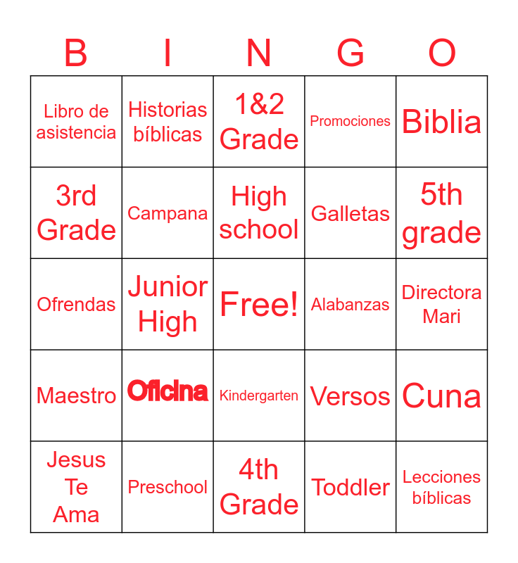 This bingo card has a free space and 24 words: Oficina, Preschool, High school, Jesus Te Ama, Biblia, Libro de asistencia, 3rd Grade, Historias bíblicas, Alabanzas, Kindergarten, Galletas, Ofrendas, Versos, Cuna, Campana, Toddler, Directora Mari, 1&2 Grade, 5th grade, Junior High, Lecciones bíblicas, Maestro, Promociones and 4th Grade.