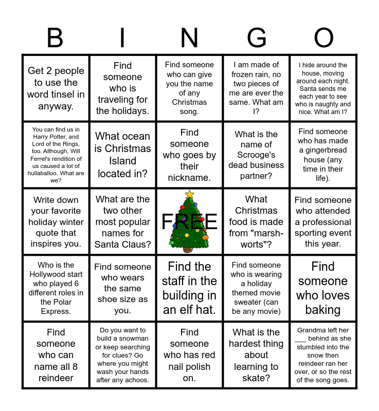 This bingo card has a free space and 24 words: Find someone who wears the same shoe size as you., Do you want to build a snowman or keep searching for clues? Go where you might wash your hands after any achoos., Find someone who goes by their nickname., Find someone who can name all 8 reindeer, I hide around the house, moving around each night. Santa sends me each year to see who is naughty and nice. What am I?, Get 2 people to use the word tinsel in anyway., You can find us in Harry Potter, and Lord of the Rings, too. Although, Will Ferrel's rendition of us caused a lot of hullaballoo. What are we?, Find someone who is traveling for the holidays., What Christmas food is made from "marsh-worts"?, Find the staff in the building in an elf hat., What is the name of Scrooge's dead business partner?, Write down your favorite holiday winter quote that inspires you., Find someone who is wearing a holiday themed movie sweater (can be any movie), Find someone who loves baking, What ocean is Christmas Island located in?, What is the hardest thing about learning to skate?, Find someone who attended a professional sporting event this year., Find someone who can give you the name of any Christmas song., Find someone who has made a gingerbread house (any time in their life)., What are the two other most popular names for Santa Claus?, Grandma left her ___ behind as she stumbled into the snow then reindeer ran her over, or so the rest of the song goes., Who is the Hollywood start who played 6 different roles in the Polar Express., I am made of frozen rain, no two pieces of me are ever the same. What am I? and Find someone who has red nail polish on..