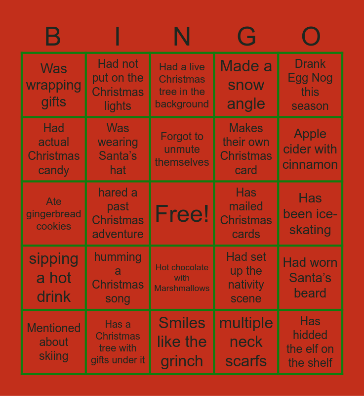 This bingo card has a free space and 24 words: humming a Christmas song, Has a Christmas tree with gifts under it, Forgot to unmute themselves, Mentioned about skiing, Drank Egg Nog this season, Was wrapping gifts, Had actual Christmas candy, Had not put on the Christmas lights, Has mailed Christmas cards, Hot chocolate with Marshmallows, Makes their own Christmas card, Ate gingerbread cookies, Had set up the nativity scene, Had worn Santa’s beard, Was wearing Santa’s hat, multiple neck scarfs, Has been ice-skating, Had a live Christmas tree in the background, Apple cider with cinnamon, hared a past Christmas adventure, Has hidded the elf on the shelf, sipping a hot drink, Made a snow angle and Smiles like the grinch.