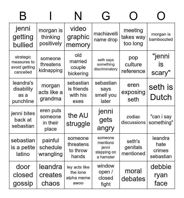 This bingo card has 36 words: someone mentions jenni stepping on a hamster, someone threatens to throw hands, window open / closed fight, strategic measures to avoid getting cancelled, jenni bites back at sebastian, sebastian says smell you later, someone threatens kidnapping, ley acts like the lone alpha meme awoo, meeting takes way too long, seth's genitals mentioned, "jenni is scary", machiavelli name drop, leandra hate crimes sebastian, morgan acts like a grandma, seth says something discriminatory, jenni getting bullied, sebastian is a petite latino, eren exposing seth, leandra's disability as a punchline, video graphic memory, sebastian is friends with his exes, eren puts someone in their place, jenni gets angry, the AU struggle, zodiac discussions, morgan is thinking positively, pop culture reference, leandra creates chaos, old married couple bickering, morgan is bamboozled, debbie ryan face, door closed gossip, "can i say something", seth is Dutch, painful schedule wrangling and moral debates.