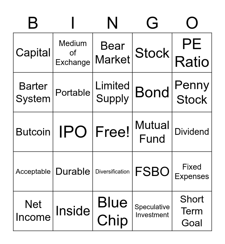 This bingo card has a free space and 24 words: Durable, Inside, Limited Supply, Net Income, PE Ratio, Capital, Barter System, Medium of Exchange, Mutual Fund, Diversification, Bond, Butcoin, FSBO, Fixed Expenses, Portable, Speculative Investment, Dividend, Bear Market, Penny Stock, IPO, Short Term Goal, Acceptable, Stock and Blue Chip.
