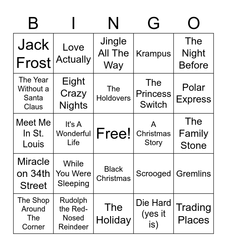 This bingo card has a free space and 32 words: Die Hard (yes it is), Home Alone, It's A Wonderful Life, Santa Claus Is Coming To Town, Miracle on 34th Street, Eight Crazy Nights, The Night Before, Gremlins, Love Actually, White Christmas, The Holdovers, Jingle All The Way, Muppets Christmas Carol, Elf, A Christmas Story, National Lampoon's Christmas Vacation, The Shop Around The Corner, Meet Me In St. Louis, Black Christmas, While You Were Sleeping, Scrooged, Klaus, The Family Stone, Rudolph the Red-Nosed Reindeer, Trading Places, Krampus, The Princess Switch, The Year Without a Santa Claus, Jack Frost, The Holiday, Last Holiday and Polar Express.