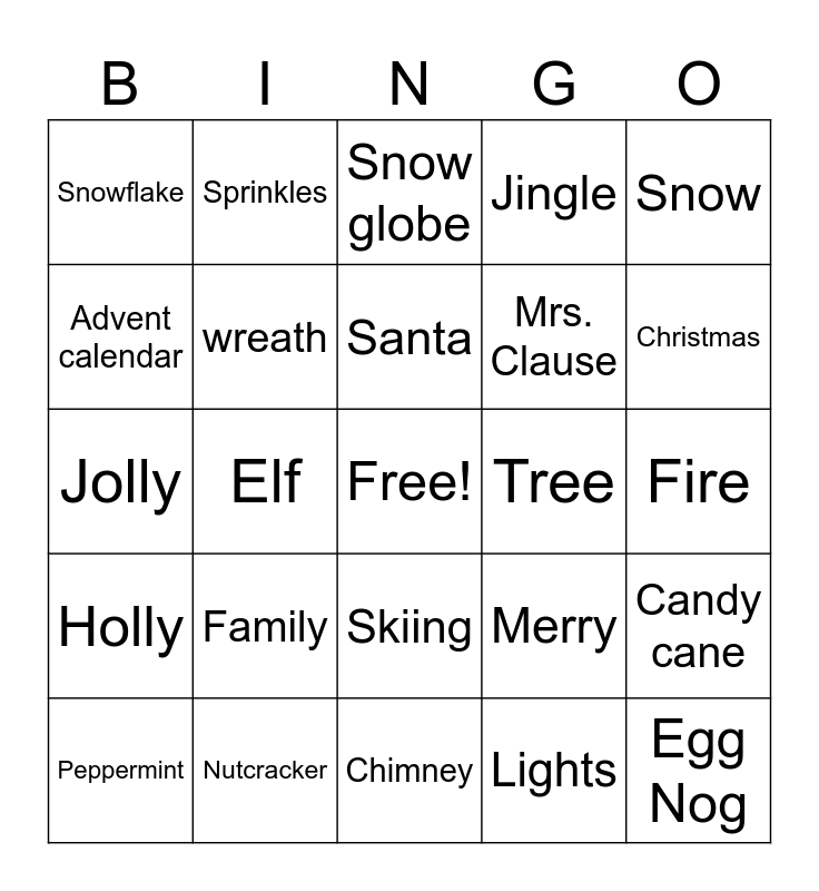 This bingo card has a free space and 50 words: Festive, Egg Nog, Spirit, Chimney, Family, Garland, Sprinkles, Cookies, Advent calendar, Angel, wreath, Jingle, Candy cane, Merry, Bell, Tinsel, Santa, Tree, Reindeer, Snow, Elf, Lights, Snowflake, Mrs. Clause, Rudolf, Xmas Eve, Christmas, Jack Frost, Snow globe, Skiing, Sledding, Snowboarding, Snowman, Nutmeg, Nutcracker, Presents, Star, Sleigh, Hot cocoa, Fire, Gingerbread, Chestnuts, Giving, Carolers, Peppermint, Jolly, Stocking, Ornaments, Holly and Mistletoe.