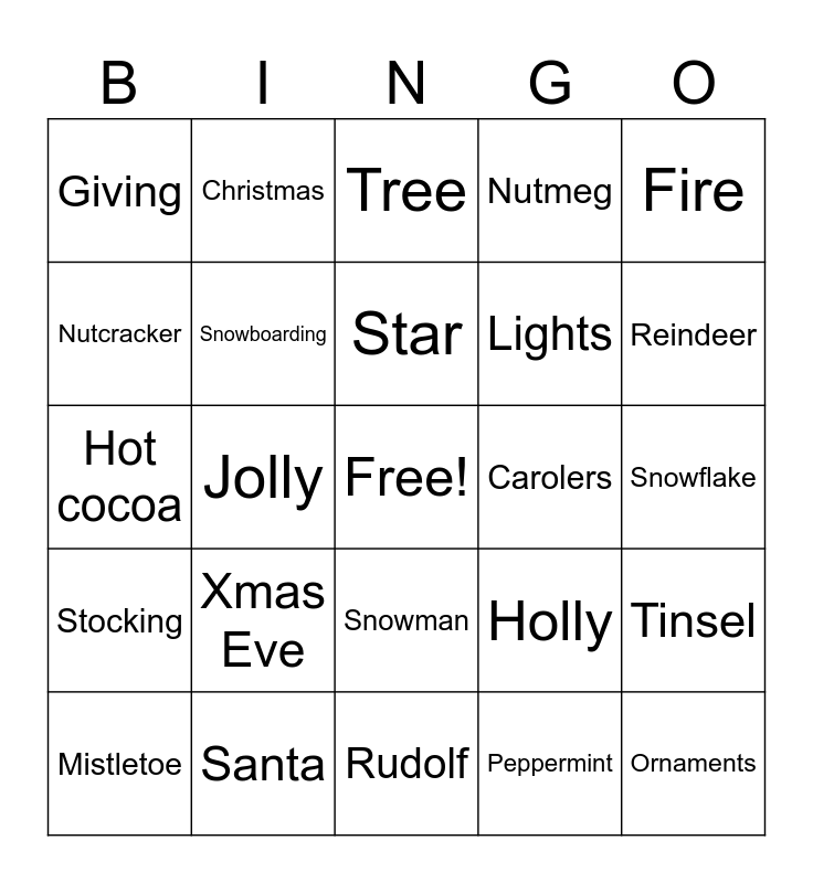 This bingo card has a free space and 35 words: Snow globe, Skiing, Sledding, Snowboarding, Snowman, Nutmeg, Nutcracker, Presents, Star, Sleigh, Hot cocoa, Fire, Gingerbread, Chestnuts, Giving, Carolers, Peppermint, Jolly, Stocking, Ornaments, Holly, Mistletoe, Tinsel, Santa, Tree, Reindeer, Snow, Elf, Lights, Snowflake, Mrs. Clause, Rudolf, Xmas Eve, Christmas and Jack Frost.