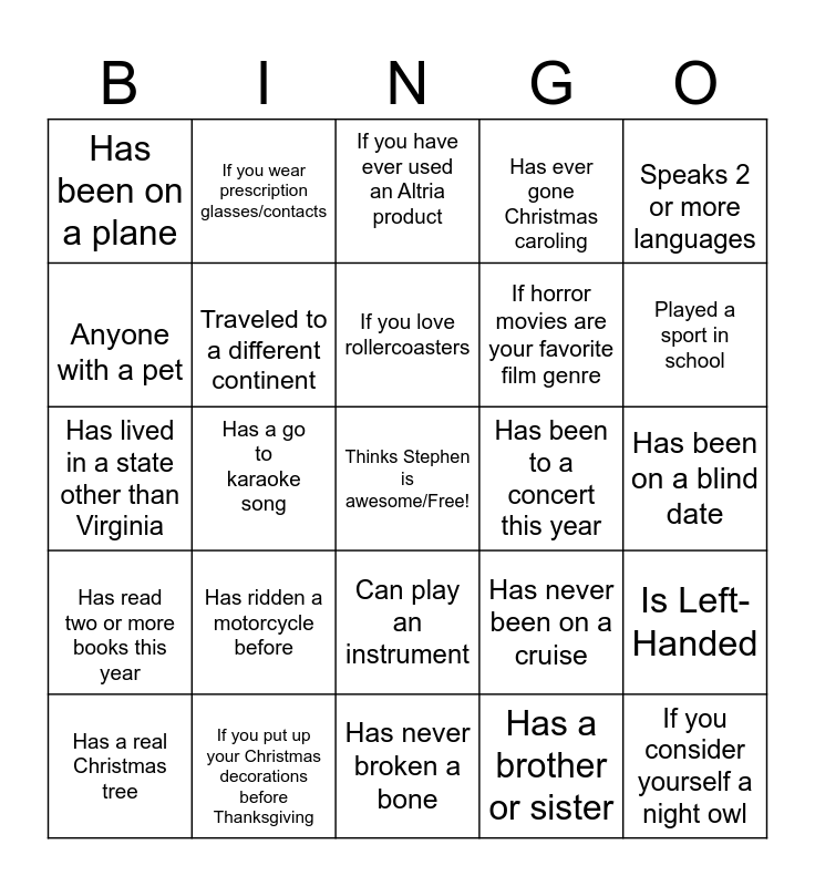 This bingo card has a free space and 24 words: Has ridden a motorcycle before, If you put up your Christmas decorations before Thanksgiving, If you love rollercoasters, Has a real Christmas tree, Speaks 2 or more languages, Has been on a plane, Anyone with a pet, If you wear prescription glasses/contacts, Has been to a concert this year, Can play an instrument, If horror movies are your favorite film genre, Has lived in a state other than Virginia, Has never been on a cruise, Is Left-Handed, Traveled to a different continent, Has a brother or sister, Has been on a blind date, If you have ever used an Altria product, Played a sport in school, Has a go to karaoke song, If you consider yourself a night owl, Has read two or more books this year, Has ever gone Christmas caroling and Has never broken a bone.