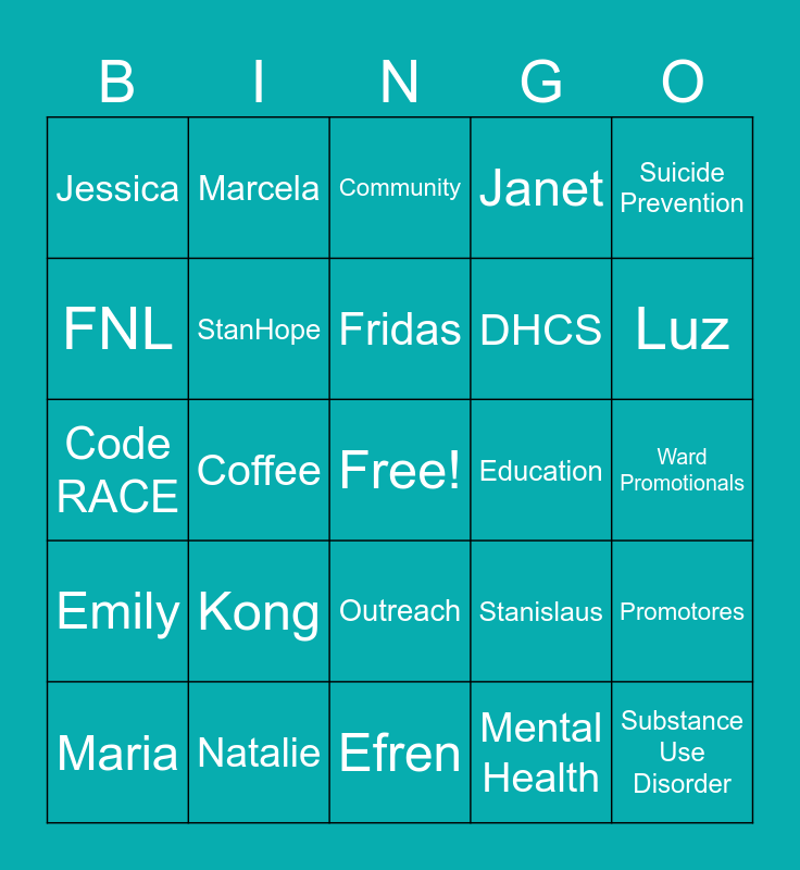 This bingo card has a free space and 44 words: Jennifer, Substance Use Disorder, Edgar, Maria, Jose, Mental Health, Community, Drop The Drugs, Suicide Prevention, Natalie, Janet, Education, Outreach, Kong, Prevention, Efren, Dittos, Code RACE, Tameika, Luz, Marcela, Marisela, Manuel, Jessica, Spyres Way, Ward Promotionals, Spyres Way, Engagement, Stanislaus, Emily, Floss, Promotores, Prevention Rocks, Haunted Storage, Coffee, MHSA, SB 326, NAMI, Fridas, FNL, DHCS, Prop 63, StanHope and EQRO.