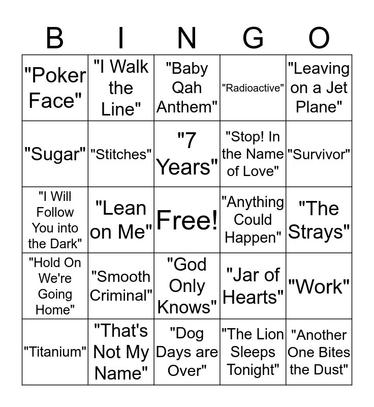 This bingo card has a free space and 24 words: "Smooth Criminal", "That's Not My Name", "7 Years", "Titanium", "Leaving on a Jet Plane", "Poker Face", "Sugar", "I Walk the Line", "Anything Could Happen", "God Only Knows", "Stop! In the Name of Love", "I Will Follow You into the Dark", "Jar of Hearts", "Work", "Stitches", "The Lion Sleeps Tonight", "The Strays", "Baby Qah Anthem", "Survivor", "Lean on Me", "Another One Bites the Dust", "Hold On We're Going Home", "Radioactive" and "Dog Days are Over".