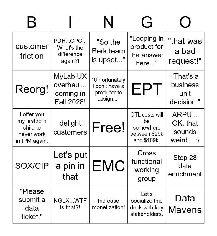 This bingo card has a free space and 24 words: Let's put a pin in that, NGLX...WTF is that?!, "Unfortunately I don't have a producer to assign...", "Please submit a data ticket.", "that was a bad request!", customer friction, Reorg!, PDH...GPC... What's the difference again?!, OTL costs will be somewhere between $29k and $109k., EMC, EPT, I offer you my firstborn child to never work in IPM again., Cross functional working group, Step 28 data enrichment, MyLab UX overhaul... coming in Fall 2028!, Let's socialize this deck with key stakeholders., ARPU... OK, that sounds weird... :\, "So the Berk team is upset...", "That's a business unit decision.", delight customers, Data Mavens, SOX/CIP, "Looping in product for the answer here..." and Increase monetization!.