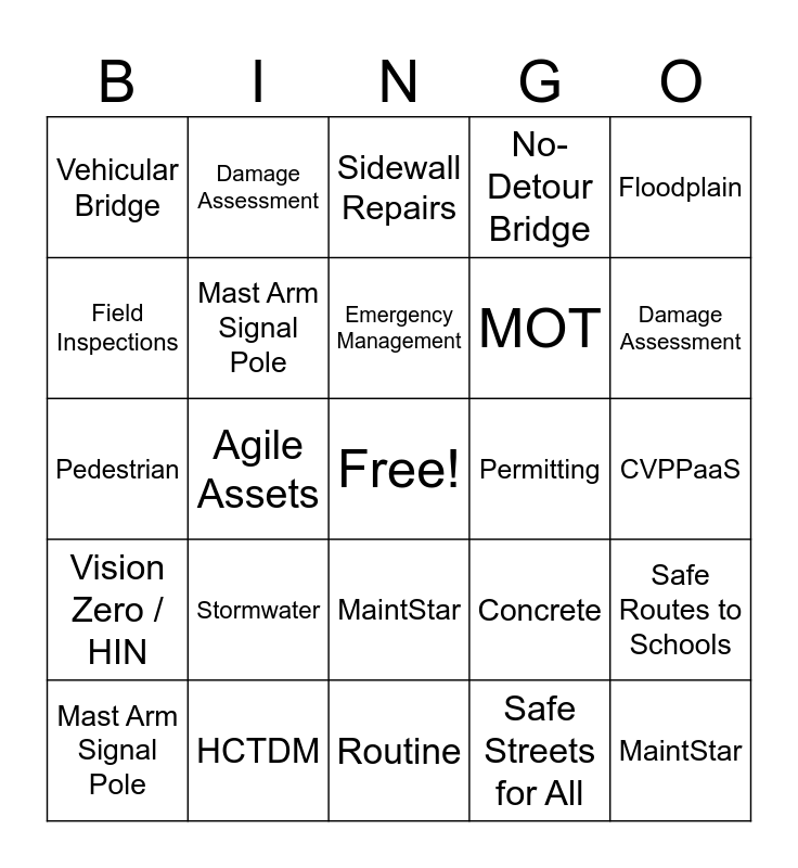 This bingo card has a free space and 90 words: Culvert, Stormwater, MaintStar, Crossdrain, Concrete, Backlog, TSD, Inventory, Traffic, Safety, MOT, TTC, O.P.E.R.A.T.E., CVPPaaS, School Zone, Emergency Management, Floodplain, Investigation, Community Rating System, Watershed, Sinkhole, Lake Monitoring, Routine, Complex, Pedestrian, HCTDM, Typical Section, Design Criteria, Complete Streets, Bicycle, Corridor Safety, Safe Routes to Schools, Safe Streets for All, Vision Zero / HIN, Vehicular Bridge, No-Detour Bridge, Sidewall Repairs, Permitting, Agile Assets, Damage Assessment, Mast Arm Signal Pole, Field Inspections, Seawall, PCI, Asphalt, Concrete, Backlog, TSD, Inventory, Traffic, Safety, MOT, TTC, Vehicular Bridge, No-Detour Bridge, Sidewall Repairs, Permitting, O.P.E.R.A.T.E., CVPPaaS, School Zone, HCTDM, Typical Section, Design Criteria, Complete Streets, Bicycle, Corridor Safety, Safe Routes to Schools, Safe Streets for All, Vision Zero / HIN, Culvert, Stormwater, MaintStar, Crossdrain, Agile Assets, Damage Assessment, Mast Arm Signal Pole, Field Inspections, Seawall, PCI, Asphalt, Emergency Management, Floodplain, Investigation, Community Rating System, Watershed, Sinkhole, Lake Monitoring, Routine, Complex and Pedestrian.