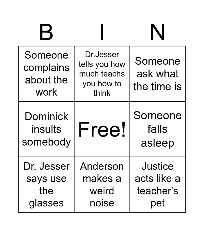 This bingo card has a free space and 9 words: Dr. Jesser says use the glasses, Dr.Jesser tells you how much teachs you how to think, Someone falls asleep, Someone complains about the work, Someone ask what the time is, Dominick insults somebody, Anderson makes a weird noise, Justice acts like a teacher's pet and Gabe ask a stupid question.