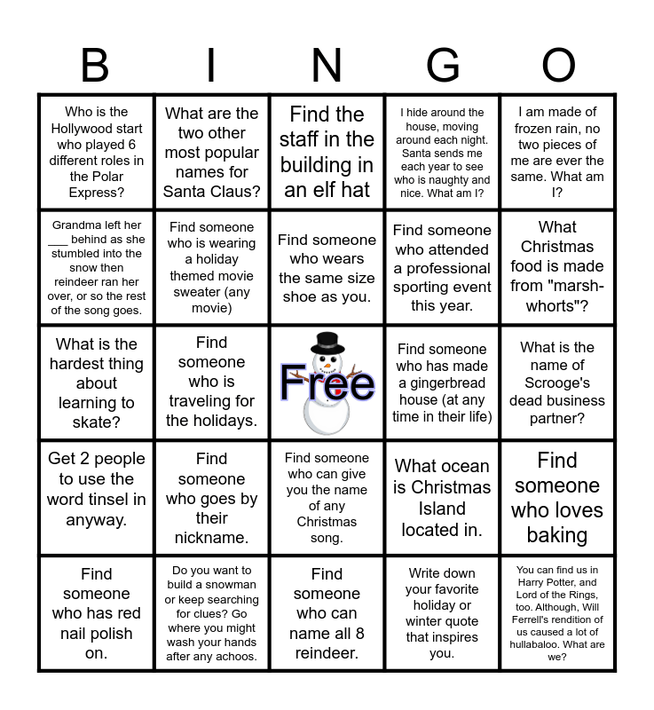 This bingo card has a free space and 24 words: Find someone who goes by their nickname., Do you want to build a snowman or keep searching for clues? Go where you might wash your hands after any achoos., Find someone who wears the same size shoe as you., Find someone who has red nail polish on., I am made of frozen rain, no two pieces of me are ever the same. What am I?, Who is the Hollywood start who played 6 different roles in the Polar Express?, Grandma left her ___ behind as she stumbled into the snow then reindeer ran her over, or so the rest of the song goes., What are the two other most popular names for Santa Claus?, Find someone who has made a gingerbread house (at any time in their life), Find someone who can give you the name of any Christmas song., Find someone who attended a professional sporting event this year., What is the hardest thing about learning to skate?, What ocean is Christmas Island located in., Find someone who loves baking, Find someone who is wearing a holiday themed movie sweater (any movie), Write down your favorite holiday or winter quote that inspires you., What is the name of Scrooge's dead business partner?, Find the staff in the building in an elf hat, What Christmas food is made from "marsh-whorts"?, Find someone who is traveling for the holidays., You can find us in Harry Potter, and Lord of the Rings, too. Although, Will Ferrell's rendition of us caused a lot of hullabaloo. What are we?, Get 2 people to use the word tinsel in anyway., I hide around the house, moving around each night. Santa sends me each year to see who is naughty and nice. What am I? and Find someone who can name all 8 reindeer..