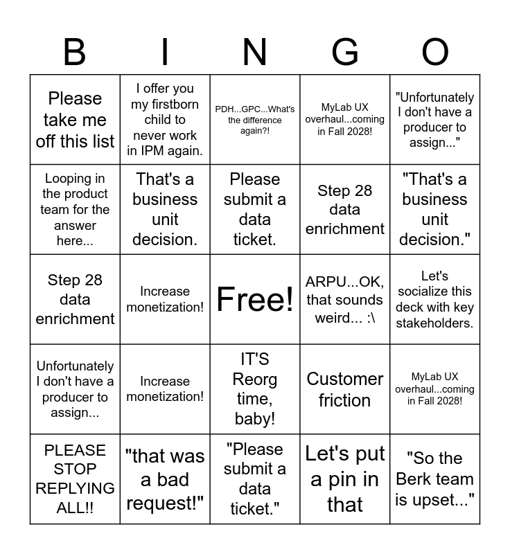 This bingo card has a free space and 44 words: OTL costs will be somewhere between $29k and $109k., "So the Berk team is upset...", Please take me off this list, PLEASE STOP REPLYING ALL!!, Let's socialize this deck with key stakeholders., Let's put a pin in that, PDH...GPC...What's the difference again?!, Customer friction, "Unfortunately I don't have a producer to assign...", "that was a bad request!", MyLab UX overhaul...coming in Fall 2028!, ARPU...OK, that sounds weird... :\, IT'S Reorg time, baby!, Increase monetization!, NGLX...WTF is that?!, "Please submit a data ticket.", "Looping in product for the answer here...", Step 28 data enrichment, Cross functional working group, "That's a business unit decision.", I offer you my firstborn child to never work in IPM again., OTL costs will be somewhere between $29k and $109k., So the Berk team is upset..., Please take me off this list, PLEASE STOP REPLYING ALL!!, Let's socialize this deck with key stakeholders., Let's put a pin in that, PDH...GPC...What's the difference again?!, Customer friction, Unfortunately I don't have a producer to assign..., that was a bad request!, MyLab UX overhaul...coming in Fall 2028!, ARPU...OK, that sounds weird... :\, IT'S Reorg time, baby!, Increase monetization!, SOX/CIP, EPT? Hybris, Web Consuming System?! OK, sure., NGLX...WTF is that?!, Please submit a data ticket., Looping in the product team for the answer here..., Step 28 data enrichment, Cross functional working group, That's a business unit decision. and I offer you my firstborn child to never work in IPM again..