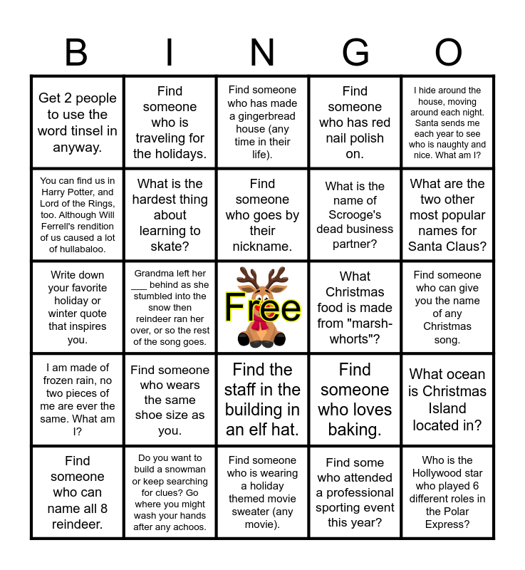 This bingo card has a free space and 24 words: Find someone who wears the same shoe size as you., Do you want to build a snowman or keep searching for clues? Go where you might wash your hands after any achoos., Find someone who goes by their nickname., Find someone who can name all 8 reindeer., I hide around the house, moving around each night. Santa sends me each year to see who is naughty and nice. What am I?, Get 2 people to use the word tinsel in anyway., You can find us in Harry Potter, and Lord of the Rings, too. Although Will Ferrell's rendition of us caused a lot of hullabaloo., Find someone who is traveling for the holidays., What Christmas food is made from "marsh-whorts"?, Find the staff in the building in an elf hat., What is the name of Scrooge's dead business partner?, Write down your favorite holiday or winter quote that inspires you., Find someone who loves baking., What ocean is Christmas Island located in?, What is the hardest thing about learning to skate?, Find some who attended a professional sporting event this year?, Find someone who can give you the name of any Christmas song., Find someone who has made a gingerbread house (any time in their life)., What are the two other most popular names for Santa Claus?, Grandma left her ___ behind as she stumbled into the snow then reindeer ran her over, or so the rest of the song goes., Who is the Hollywood star who played 6 different roles in the Polar Express?, I am made of frozen rain, no two pieces of me are ever the same. What am I?, Find someone who has red nail polish on. and Find someone who is wearing a holiday themed movie sweater (any movie)..
