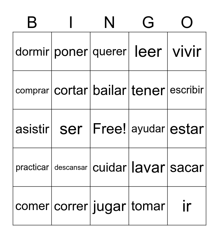 This bingo card has a free space and 24 words: descansar, correr, bailar, comer, vivir, dormir, comprar, poner, ayudar, cuidar, tener, asistir, lavar, sacar, cortar, tomar, estar, querer, escribir, ser, ir, practicar, leer and jugar.
