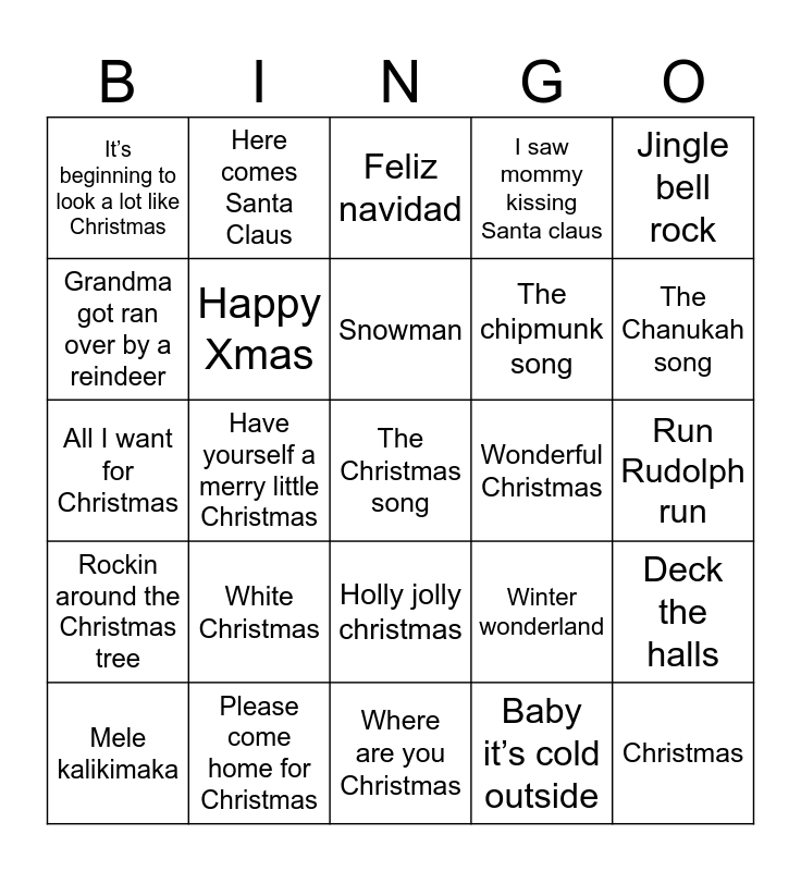 This bingo card has 39 words: Santa Claus is coming to town, Blue Christmas, Silent night, Happy Xmas, Mele kalikimaka, Holly jolly christmas, Snowman, Let it snow!, Jingle bell rock, Rockin around the Christmas tree, Have yourself a merry little Christmas, I saw mommy kissing Santa claus, The Christmas song, Run Rudolph run, Wonderful Christmas, White Christmas, Your a mean one, Mr.grinch 2, It’s beginning to look a lot like Christmas, Somewhere in my memory, Winter wonderland, Grandma got ran over by a reindeer, Where are you Christmas, The chipmunk song, The Chanukah song, Setting the trap, Your a mean one, Mr.grinch, Christmas, Merry christmas, Happy holidays, Sleigh ride, Here comes Santa Claus, I want a hippopotamus for Christmas, You make it feel like Christmas, Feliz navidad, Please come home for Christmas, Baby it’s cold outside, Carol of the bells, Deck the halls, All I want for Christmas and Last Christmas.