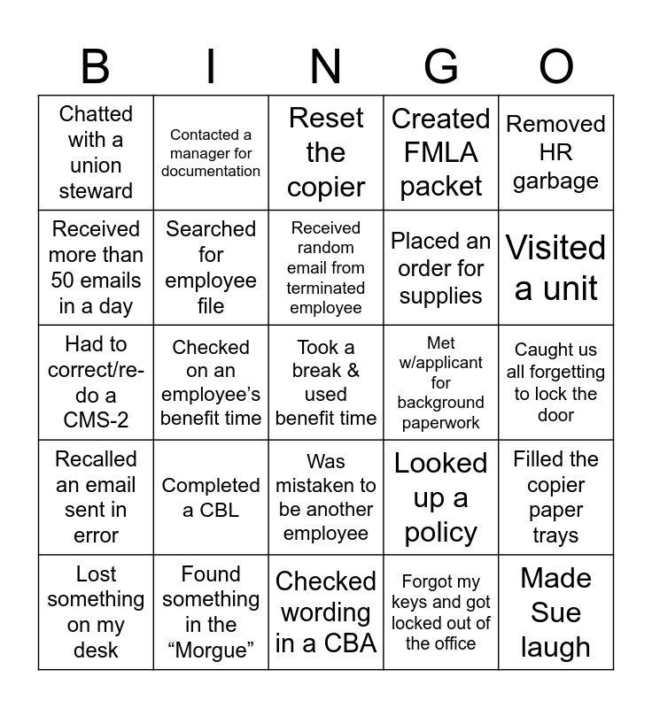 This bingo card has a free space and 40 words: Received suspicious Dr note, Had to correct/re-do a CMS-2, Sat through employee file review, Searched for employee file, Found something in the “Morgue”, Was mistaken to be another employee, Received random email from terminated employee, Completed a VOE, Removed HR garbage, Recalled an email sent in error, Checked on an employee’s benefit time, Created FMLA packet, Made Sue laugh, Caught us all forgetting to lock the door, Met w/applicant for background paperwork, Completed a CBL, Attended a webinar, Chatted with a union steward, Pulled attendance records in Timekeeping, Reset the copier, Filled the copier paper trays, Forgot my keys and got locked out of the office, Placed an order for supplies, Received more than 50 emails in a day, Celebrated my birthday, Celebrated my work anniversary, Rebooted my computer midday, Had MIS help me, Dug something out of the recycle bin, “Liar Liar, pants on fire” applied to one situation, Pulled the same employee file twice today, Lost something on my desk, Snuck up on Sue and scared her, Looked up a policy, Visited a unit, Checked wording in a CBA, Completed my filing today, Caught us all forgetting to unlock the door (AM or PM), Contacted a manager for documentation and Explained a policy to an employee.