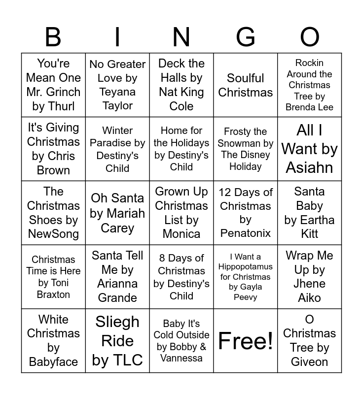 This bingo card has 30 words: Sliegh Ride by TLC, Christmas Don't be Late by The Chipmunks, Oh Santa by Mariah Carey, Platinum Bells by Destiny's Child, You're Mean One Mr. Grinch by Thurl, Deck the Halls by Nat King Cole, Winter Paradise by Destiny's Child, 8 Days of Christmas by Destiny's Child, 12 Days of Christmas by Penatonix, Baby It's Cold Outside by Bobby & Vannessa, Santa Baby by Eartha Kitt, Grown Up Christmas List by Monica, Free!, O Christmas Tree by Giveon, All I Want by Asiahn, Silent Night by The Temtations, I Want a Hippopotamus for Christmas by Gayla Peevy, Christmas Time is Here by Toni Braxton, Santa Tell Me by Arianna Grande, Rockin Around the Christmas Tree by Brenda Lee, The Christmas Shoes by NewSong, Run Rudolph Run by Chuck Berry, No Greater Love by Teyana Taylor, Frosty the Snowman by The Disney Holiday, It's Giving Christmas by Chris Brown, Soulful Christmas, Wrap Me Up by Jhene Aiko, White Christmas by Babyface, Home for the Holidays by Destiny's Child and Let It Snow by Boys II Men.