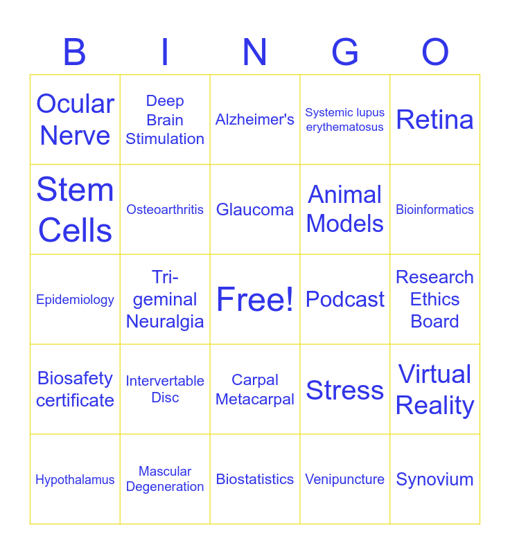 This bingo card has a free space and 24 words: Intervertable Disc, Mascular Degeneration, Glaucoma, Hypothalamus, Retina, Ocular Nerve, Stem Cells, Deep Brain Stimulation, Podcast, Carpal Metacarpal, Animal Models, Epidemiology, Stress, Virtual Reality, Osteoarthritis, Venipuncture, Research Ethics Board, Alzheimer's, Bioinformatics, Tri-geminal Neuralgia, Synovium, Biosafety certificate, Systemic lupus erythematosus and Biostatistics.