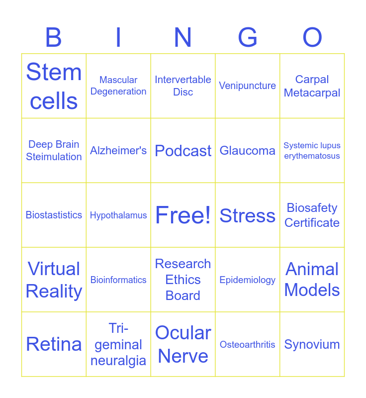This bingo card has a free space and 24 words: Bioinformatics, Tri-geminal neuralgia, Podcast, Retina, Carpal Metacarpal, Stem cells, Deep Brain Steimulation, Mascular Degeneration, Stress, Research Ethics Board, Glaucoma, Biostastistics, Epidemiology, Animal Models, Alzheimer's, Osteoarthritis, Biosafety Certificate, Intervertable Disc, Systemic lupus erythematosus, Hypothalamus, Synovium, Virtual Reality, Venipuncture and Ocular Nerve.