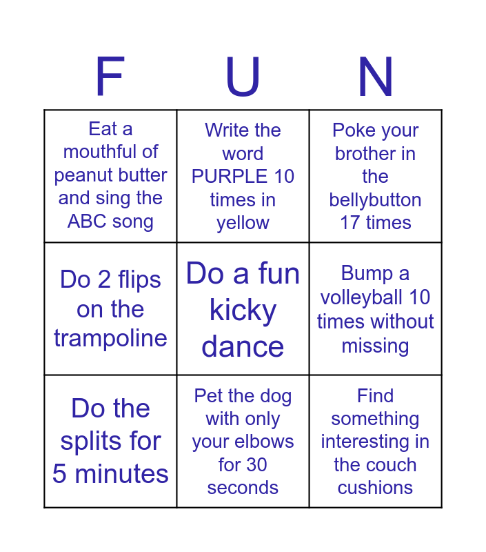 This bingo card has 9 words: Do the splits for 5 minutes, Poke your brother in the bellybutton 17 times, Write the word PURPLE 10 times in yellow, Do 2 flips on the trampoline, Eat a mouthful of peanut butter and sing the ABC song, Bump a volleyball 10 times without missing, Do a fun kicky dance, Find something interesting in the couch cushions and Pet the dog with only your elbows for 30 seconds.