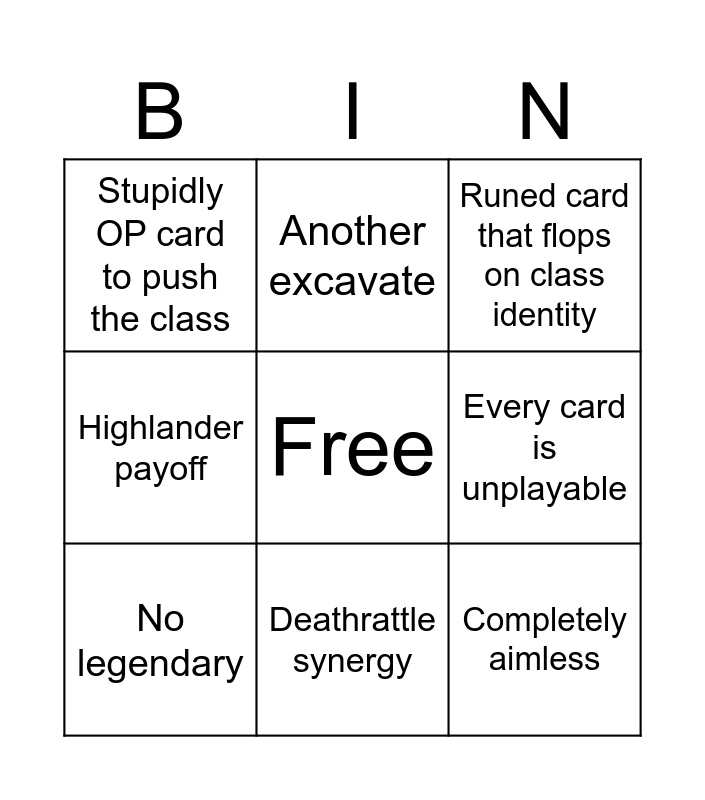 This bingo card has a free space and 8 words: Every card is unplayable, Runed card that flops on class identity, Another excavate, No legendary, Stupidly OP card to push the class, Completely aimless, Highlander payoff and Deathrattle synergy.