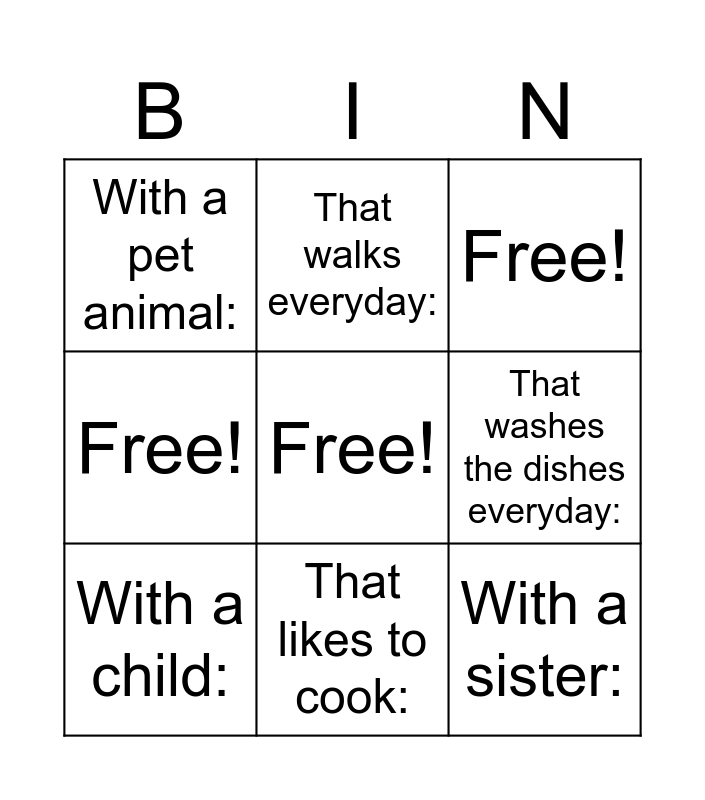 This bingo card has a free space and 8 words: That washes the dishes everyday:, Free!, That walks everyday:, With a child:, With a pet animal:, With a sister:, Free! and That likes to cook:.