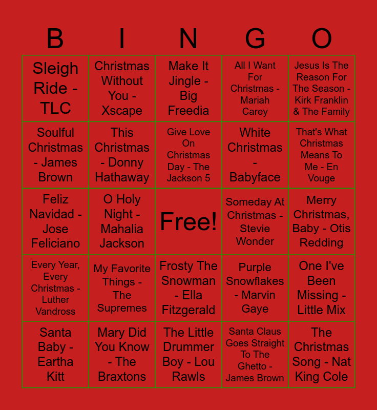 This bingo card has a free space and 39 words: My Gift To You - Alexander O'Neal, Let It Snow - Boyz II Men, 8 Days Of Christmas - Destiny's Child, This Christmas - Donny Hathaway, Santa Baby - Eartha Kitt, Frosty The Snowman - Ella Fitzgerald, Give Love On Christmas Day - The Jackson 5, I Saw Mommy Kissing Santa Claus - The Jackson 5, Jesus Is The Reason For The Season - Kirk Franklin & The Family, Every Year, Every Christmas - Luther Vandross, O Holy Night - Mahalia Jackson, All I Want For Christmas - Mariah Carey, The Christmas Song - Nat King Cole, Merry Christmas, Baby - Otis Redding, Someday At Christmas - Stevie Wonder, My Favorite Things - The Supremes, Silent Night - The Temptations, Sleigh Ride - TLC, Do You Hear What I Hear - Whitney Houston, Purple Snowflakes - Marvin Gaye, Soulful Christmas - James Brown, The Little Drummer Boy - Lou Rawls, White Christmas - Babyface, That's What Christmas Means To Me - En Vouge, Christmas In Hollis - Run DMC, No Gift - Tamar Braxton, Christmas In The City - Mary J Blige, This Christmas - Chris Brown, Oh Come Emmanuel - The Clark Sisters, Christmas Without You - Xscape, Joy To The World - Whitney Houston, It's Christmas All Over The World - New Edition, Make It Jingle - Big Freedia, Mary Did You Know - The Braxtons, Santa Claus Goes Straight To The Ghetto - James Brown, Santa Baby - Khia, One I've Been Missing - Little Mix, Feliz Navidad - Jose Feliciano and Knockin' Boots For Christmas - H Town.