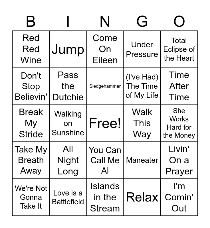 This bingo card has a free space and 29 words: We're Not Gonna Take It, Wanna Be Startin' Somethin', Walking on Sunshine, Jump (For My Love), Red Red Wine, Come On Eileen, Pass the Dutchie, All Night Long, Walk This Way, Love is a Battlefield, She Works Hard for the Money, I'm Comin' Out, Islands in the Stream, Relax, Time After Time, Thriller, You Can Call Me Al, Take My Breath Away, Total Eclipse of the Heart, Break My Stride, Maneater, Eternal Flame, (I've Had) The Time of My Life, Don't Stop Believin', Under Pressure, Jump, Livin' On a Prayer, Sledgehammer and Alone.